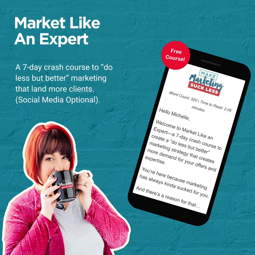 Market Like an Expert is a free 7-day email course that helps you ditch the marketing "shoulds" and build a strategy that actually fits your business. You'll walk away knowing exactly what to keep, what to cut, and how to make social media completely optional.