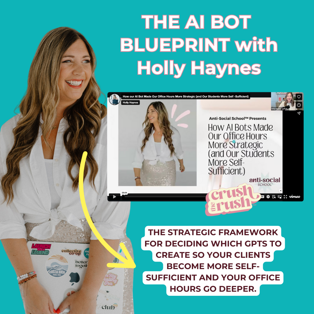 The AI Bot Blueprint teaches the strategy behind deciding which GPTs to create, where they belong in your client journey, and what should stay human. Learn how to design smarter support systems so clients come prepared—and your live calls go deeper, not repetitive.
